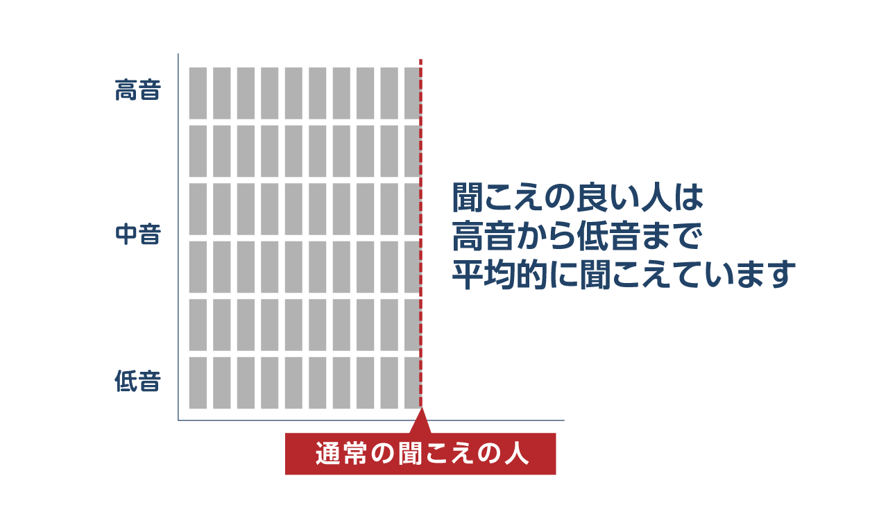 聞こえの状態は人それぞれで、高音が聞こえにくい人、低音が聞こえにくい人、またその程度も千差万別です。