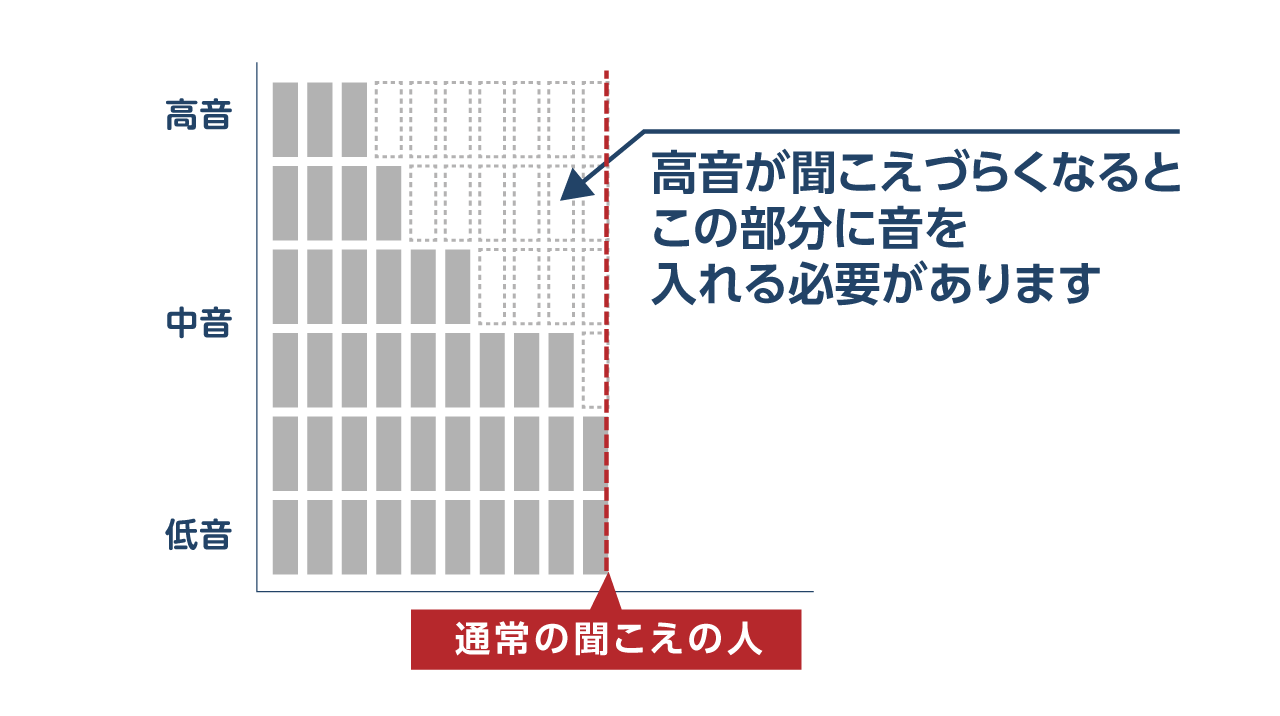 高音が聞こえにくくなった人の例だと、下図の白の部分に音を入れる必要があります。
