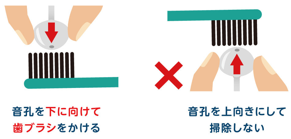 音孔(音の出口)に耳垢がつまっていないか確認します。つまっていたら補聴器用ブラシまたは歯ブラシなどで取り除いてください。