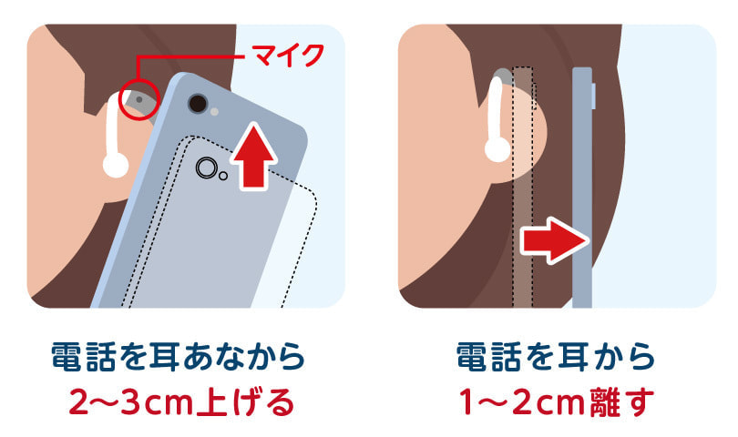 耳掛け型は、耳より上にマイクがあるため、今までと同じ位置に電話(受話器)をあてると、うまく聞きとることができません。電話を2〜3cm上にして、耳から1〜2cm離すと聞きとりやすくなります。 練習には177天気予報電話サービスなどを使い、聞きとりやすい位置を探してみましょう。電話の位置をご家族や周囲の方に見てもらうのも良い方法です。耳あな型は、耳から1〜2cm離すだけでOKです。両耳装用なら反対側の電源を切ることをおすすめします。