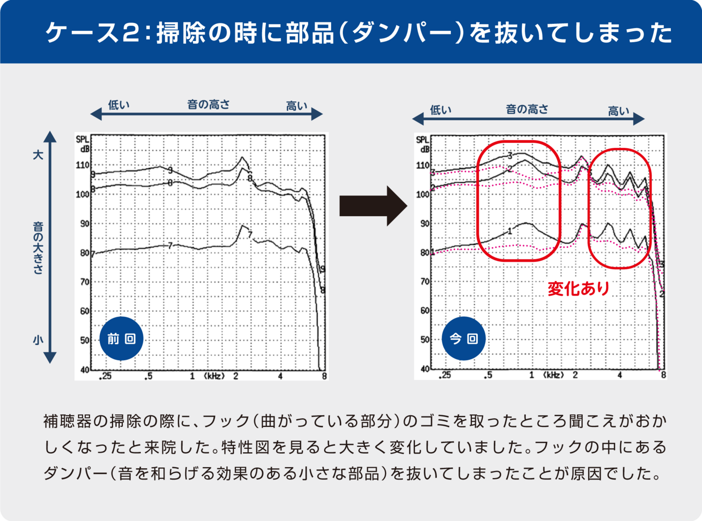補聴器に何かトラブルがあると、特性図に変化が表れます。前回調整をした時の特性図と比較することで、補聴器が正常に音を出しているか確認できます。