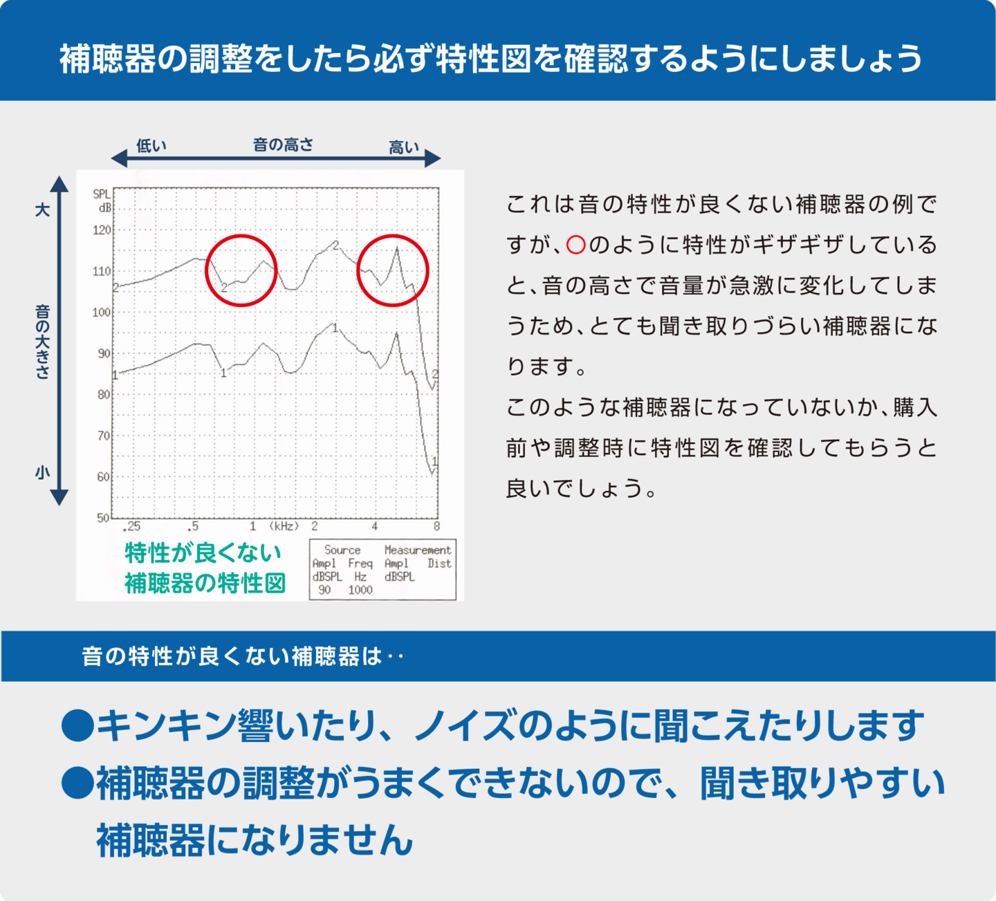 特性図は補聴器から実際に出ている音を測定したものです。この線がなめらかでない補聴器は、キンキン響いたり、音が歪んで聞こえたりします。