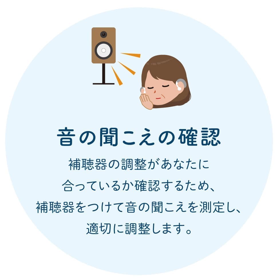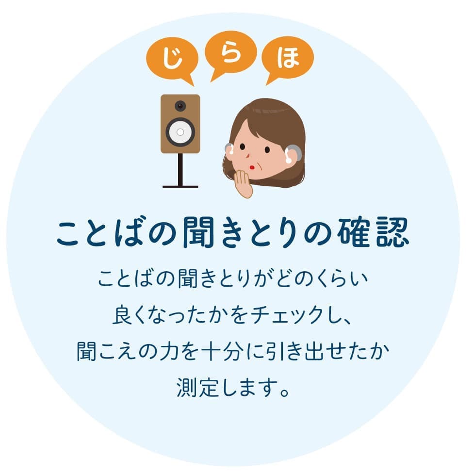 購入前にする主な検査は、「音の聞こえの確認」と「ことばの聞きとりの確認」です。この2つの検査は、必ず行うようにしましょう。