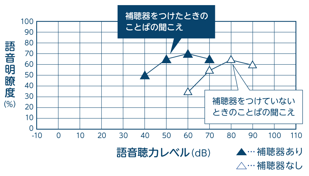 目標値:50〜60dBの音に対して、補聴器をつけたときの数値(▲)が、補聴器をつけていないとき(△)のもっとも高い数値と同じか、少し上のレベル