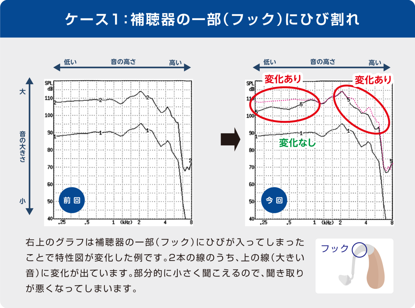 補聴器に何かトラブルがあると、特性図に変化が表れます。前回調整をした時の特性図と比較することで、補聴器が正常に音を出しているか確認できます。