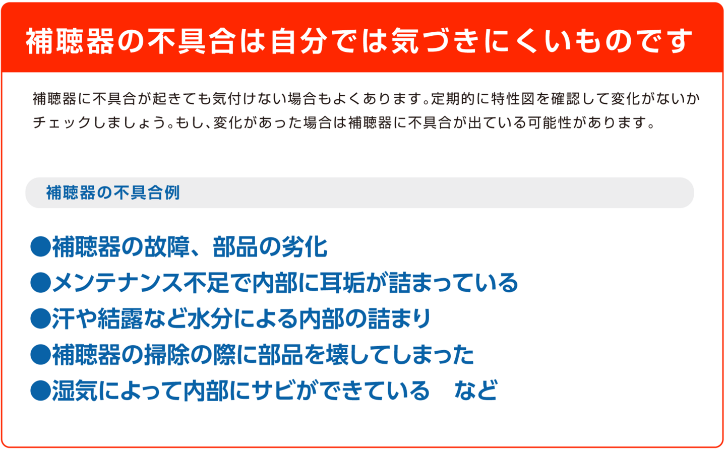 定期的に特性測定をすると、補聴器に異常や故障がないかを早期に発見することもできます。