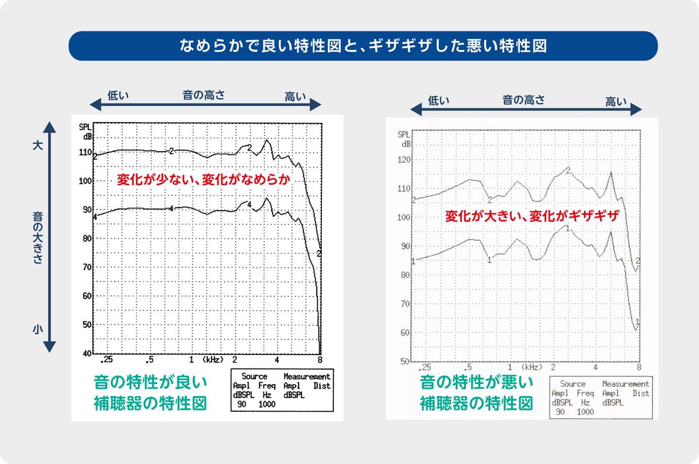 特性図は補聴器から実際に出ている音を測定したものです。この線がなめらかでない補聴器は、キンキン響いたり、音が歪んで聞こえたりします。